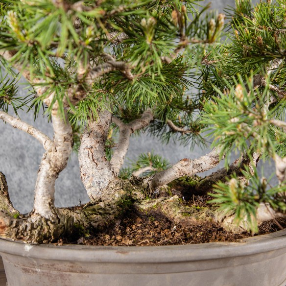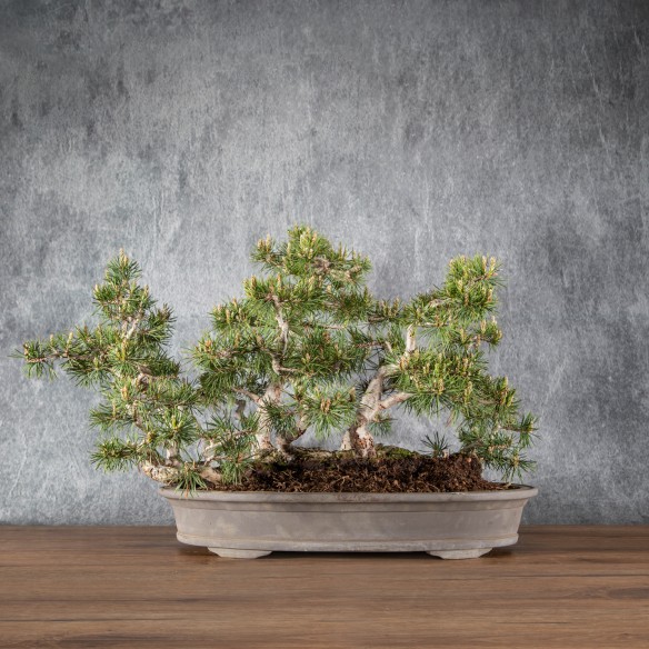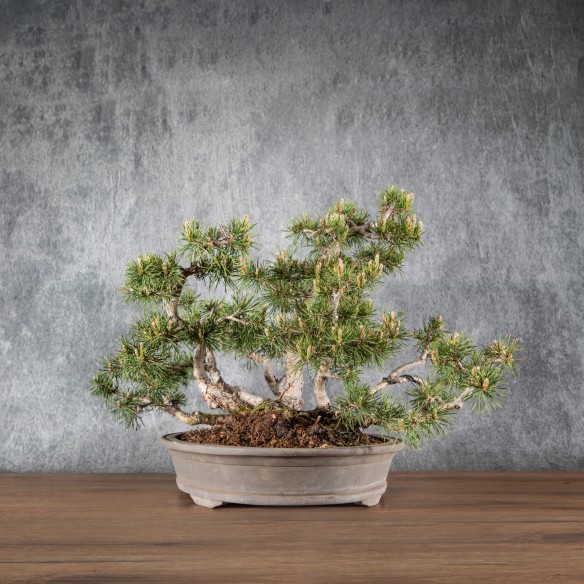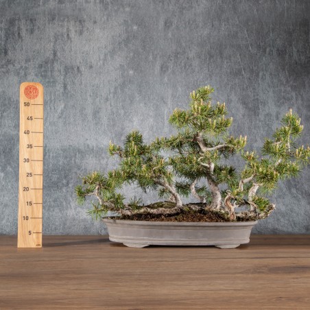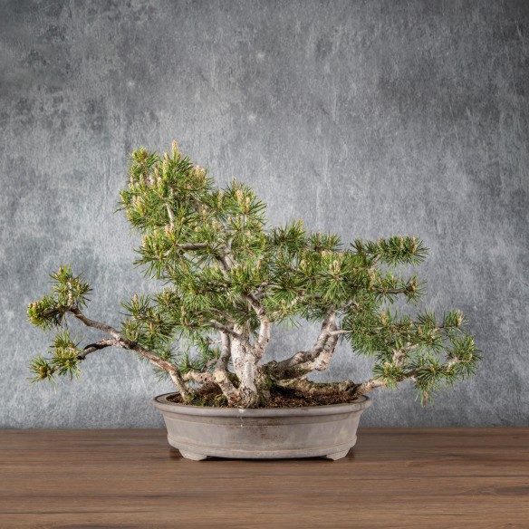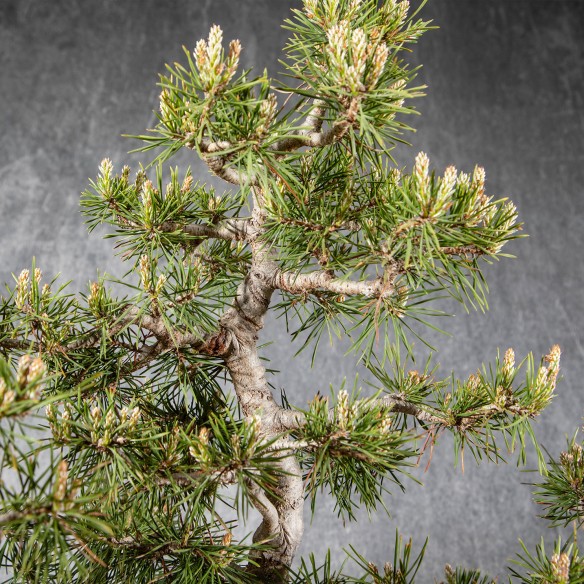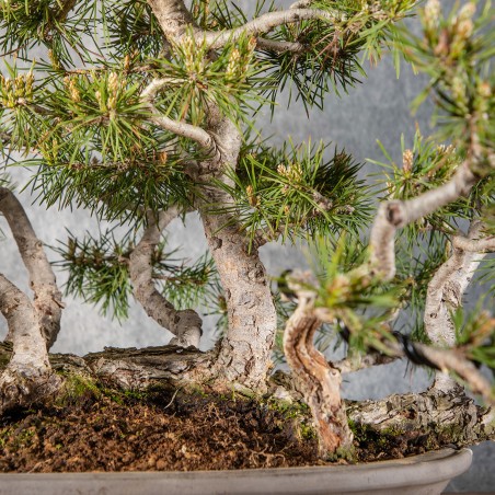 Originario de Europa, el Pinus sylvestris es una especie muy apreciada en bonsái por su tronco robusto, agujas largas y rígidas y fuerte carácter visual. La corteza fina y rojiza de los árboles jóvenes evoluciona hacia tonos marrones y agrietados con la edad, aportando gran interés ornamental.