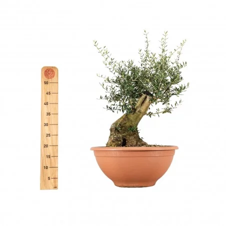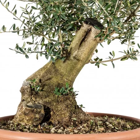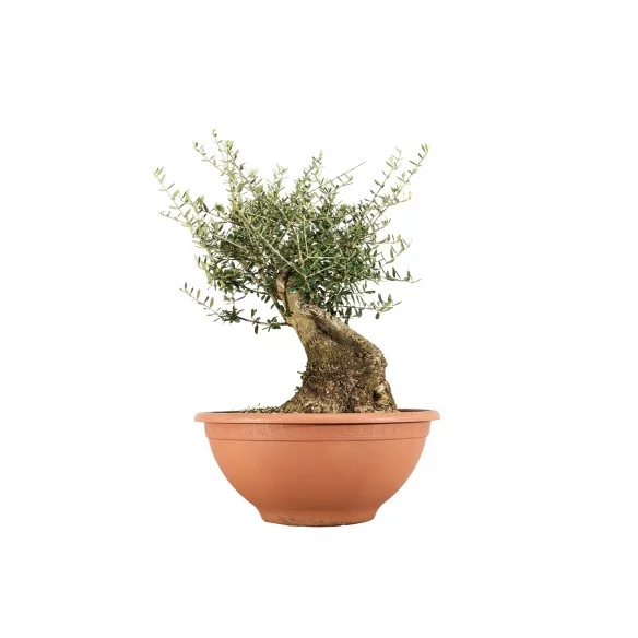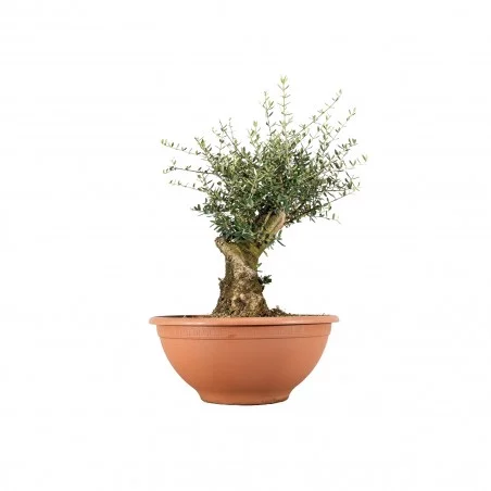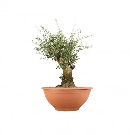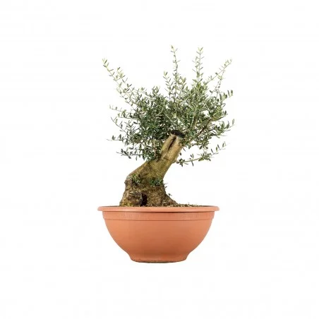 Originaria de Europa, Olea europaea sylvestris es muy apreciada en bonsái por su tronco retorcido, madera antigua y corteza profundamente texturizada, que transmiten edad y carácter mediterráneo. Sus hojas pequeñas, coriáceas y de tono verde grisáceo aportan un aspecto sobrio y atemporal, manteniendo interés visual durante todo el año.