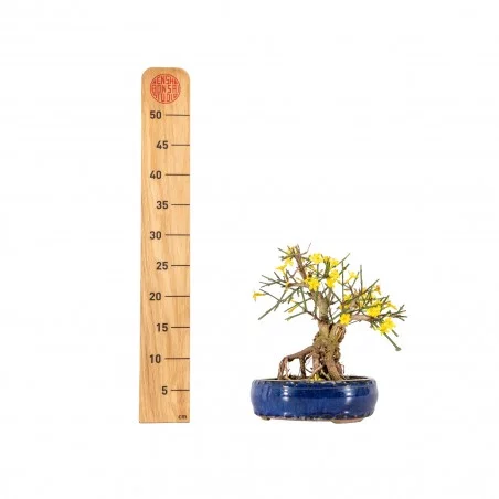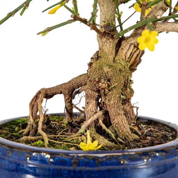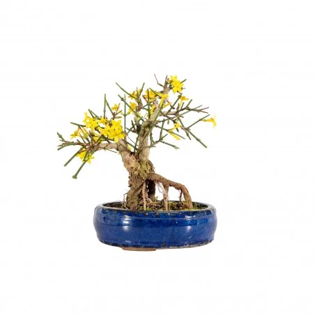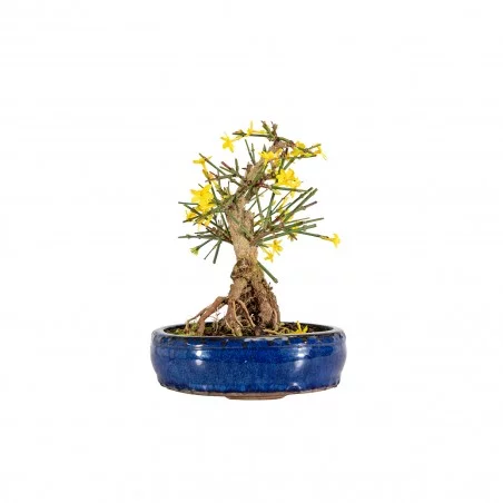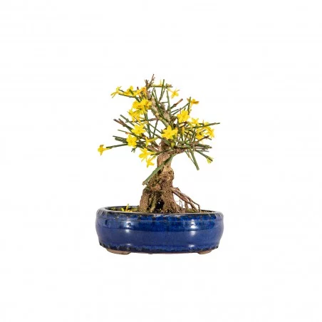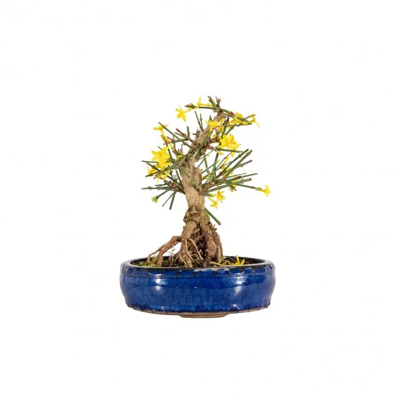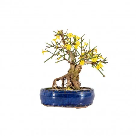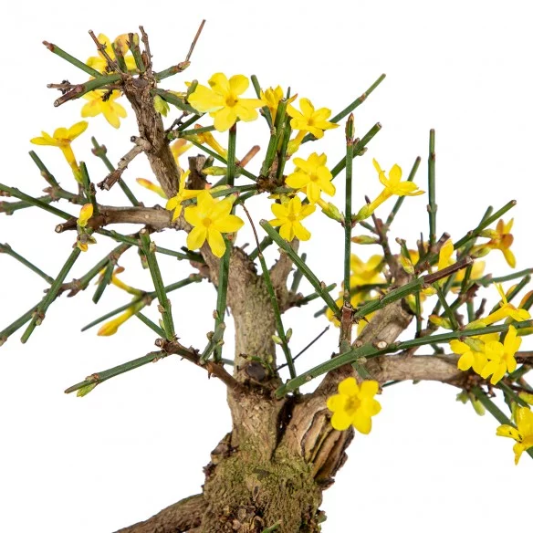 Originario de Asia, Jasminum nudiflorum es muy apreciado en bonsái por su crecimiento flexible, ramificación elegante y llamativa floración invernal. Sus ramas verdes y arqueadas crean una silueta ligera y dinámica, mientras que la ausencia de hojas durante la floración realza su carácter gráfico y estacional.
