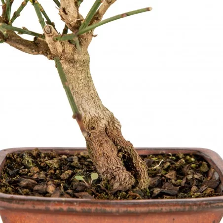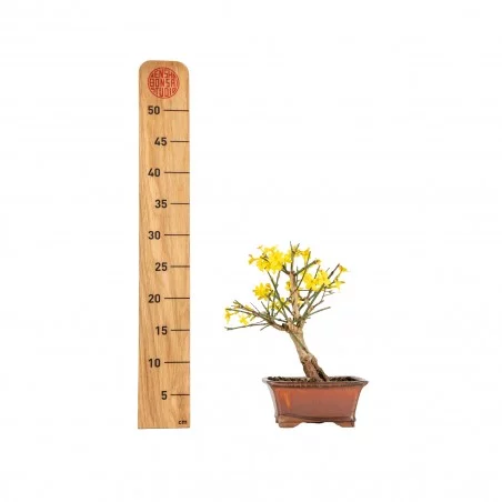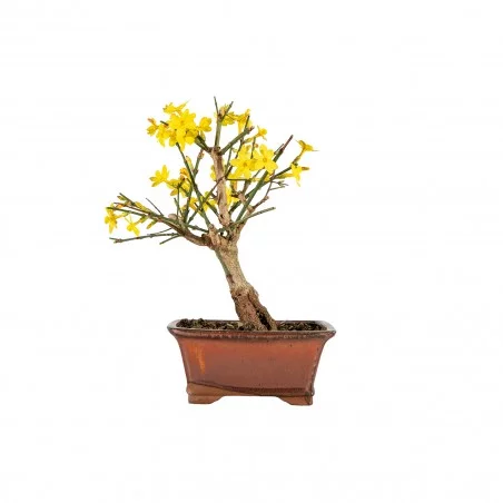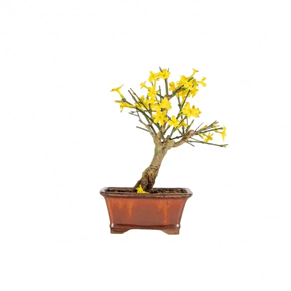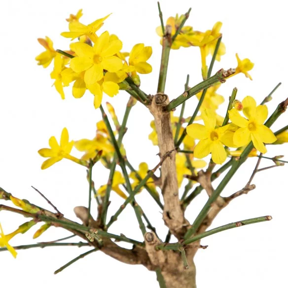 Originario de Asia, Jasminum nudiflorum es muy apreciado en bonsái por su crecimiento flexible, ramificación elegante y llamativa floración invernal. Sus ramas verdes y arqueadas crean una silueta ligera y dinámica, mientras que la ausencia de hojas durante la floración realza su carácter gráfico y estacional.