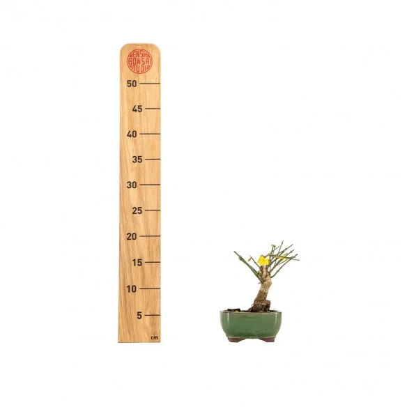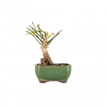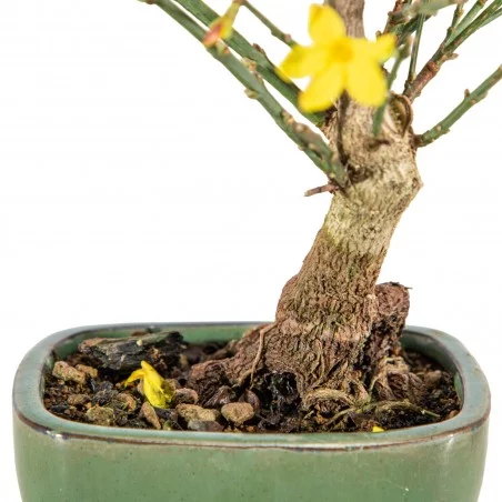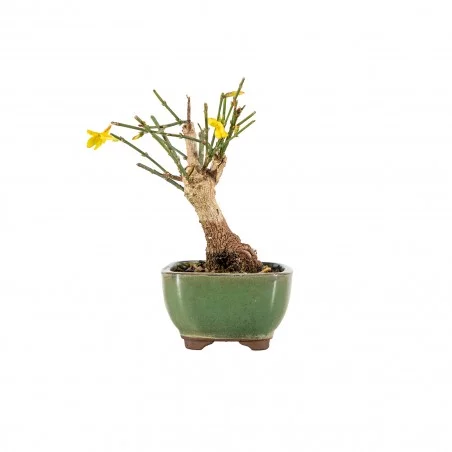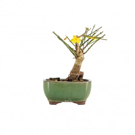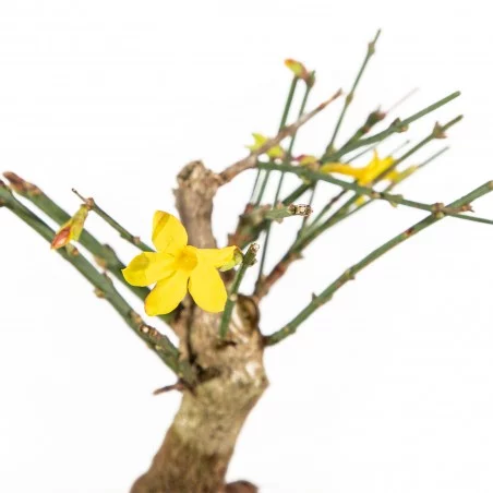 Originario de Asia, Jasminum nudiflorum es muy apreciado en bonsái por su crecimiento flexible, ramificación elegante y llamativa floración invernal. Sus ramas verdes y arqueadas crean una silueta ligera y dinámica, mientras que la ausencia de hojas durante la floración realza su carácter gráfico y estacional.