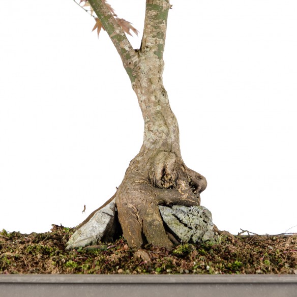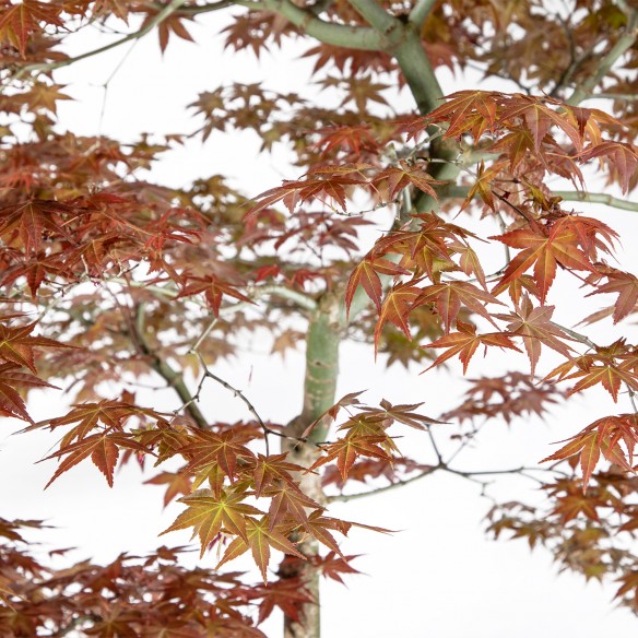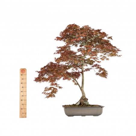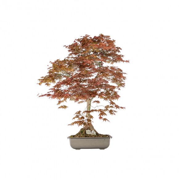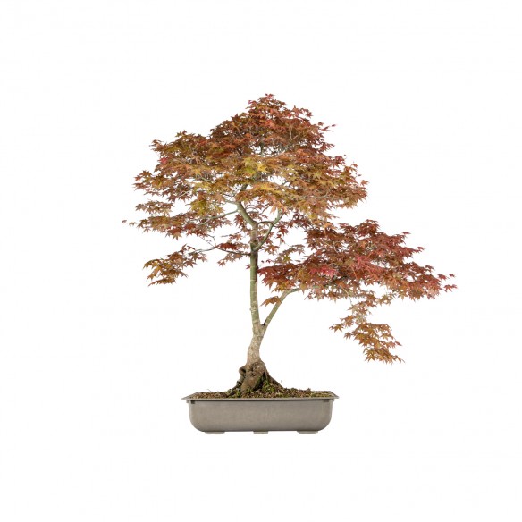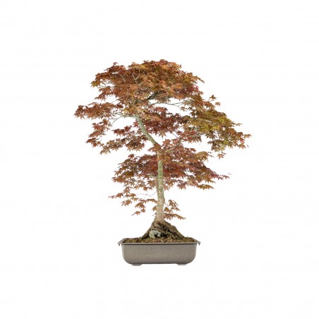 Originario de Asia, el Acer palmatum ‘Deshojo’ es una especie muy apreciada en bonsái por su brotación primaveral de color rojo intenso, que evoluciona hacia tonos más suaves a lo largo de la estación. Sus hojas palmeadas aportan ligereza y elegancia, mientras que la ramificación fina permite composiciones equilibradas y expresivas.