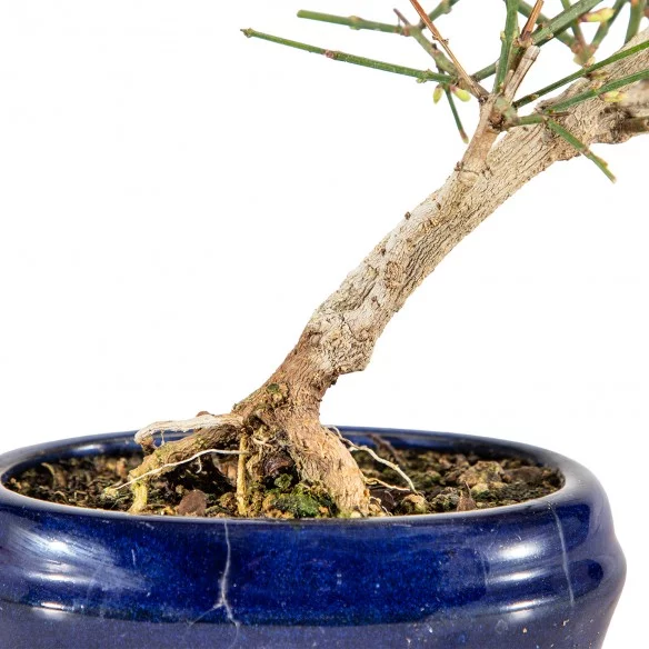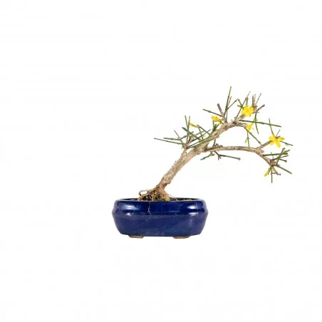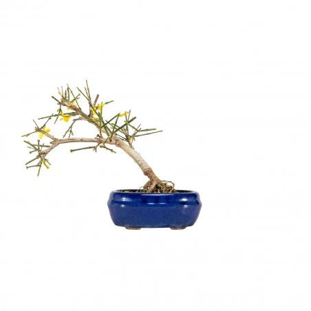 Originária da Ásia, a Jasminum nudiflorum é uma espécie muito apreciada no bonsai pelo seu crescimento flexível, ramificação graciosa e floração invernal marcante. Os ramos verdes e arqueados criam uma silhueta leve e dinâmica, enquanto a ausência de folhas durante a floração realça o caráter gráfico e sazonal da árvore.