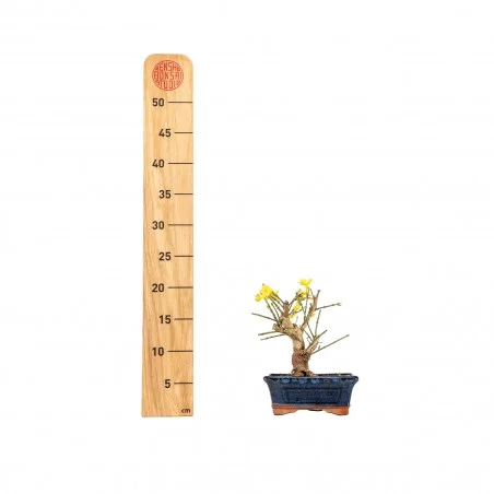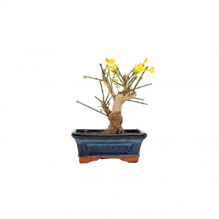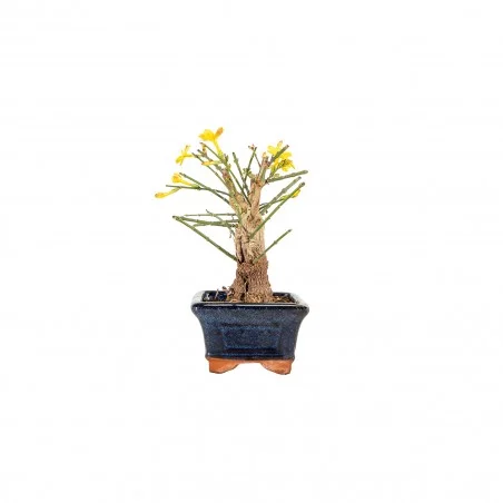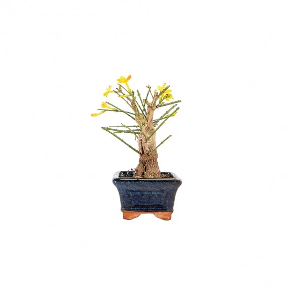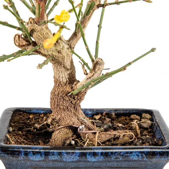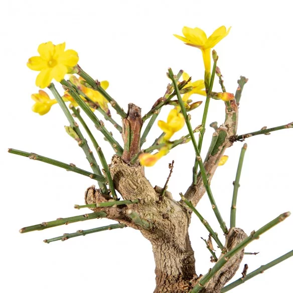 Originária da Ásia, a Jasminum nudiflorum é uma espécie muito apreciada no bonsai pelo seu crescimento flexível, ramificação graciosa e floração invernal marcante. Os ramos verdes e arqueados criam uma silhueta leve e dinâmica, enquanto a ausência de folhas durante a floração realça o caráter gráfico e sazonal da árvore.