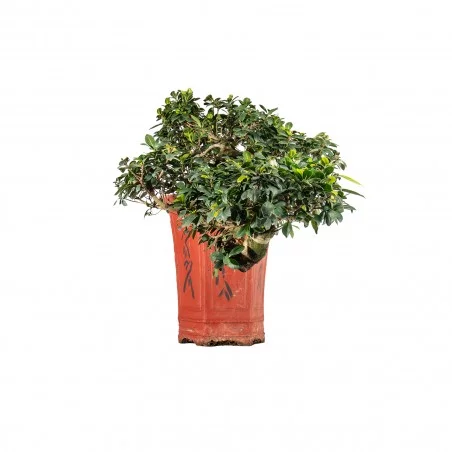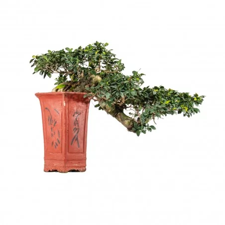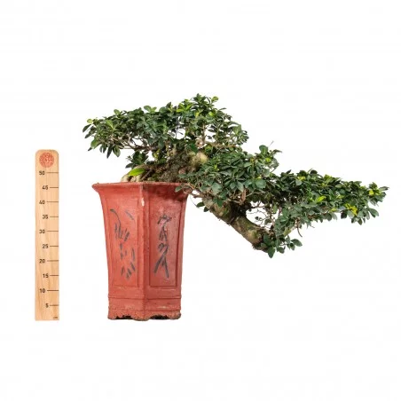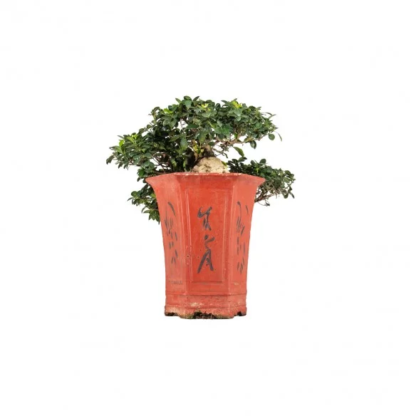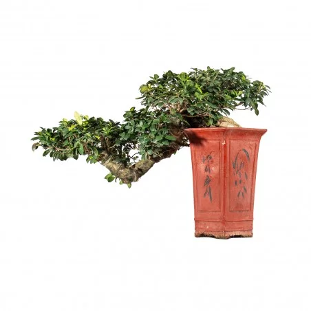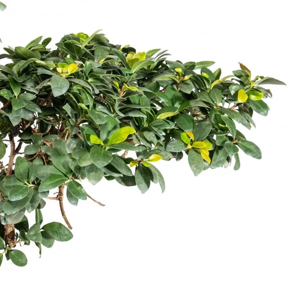 Originária da Ásia, a Ficus retusa é uma espécie perene muito apreciada no bonsai pelo seu tronco robusto, raízes aéreas expressivas e crescimento vigoroso. As folhas ovais, de verde intenso e textura coriácea, conferem um aspeto tropical equilibrado, tornando-a uma espécie versátil e resistente.